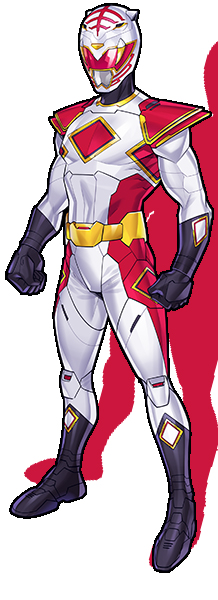 A ghost image of the Power Coin appeared and wrapped around, a digital matrix making a red power suit appear with white stripes and diamond shapes. White boots and gloves were both crowned by red diamonds. A side arm blaster appeared along with a gold belt. The las thing to appear was a T-Rex themed helmet.